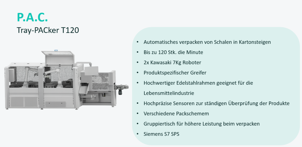 Unser Portfoliopraktisch, performant, kompakt. Der TrayPACker ist eine leistungsstarke Verpackungslösung für industrielle Anwendungen, die Produkte zuverlässig und präzise in dafür vorgesehene Karton-Steigen verpackt. Ausgelegt für hohe Durchsatzraten verarbeitet die Anlage je nach Konfiguration zwischen 60 und 120 Verpackungen pro Minute und gewährleistet dabei eine konstant hohe Prozesssicherheit. Dank des modularen und kundenindividuellen Aufbaus lässt sich die Maschine exakt auf produktspezifische Anforderungen, unterschiedliche Formate und bestehende Linienkonzepte abstimmen. Die kompakte, platzsparende Bauweise ermöglicht eine einfache Integration auch bei begrenzten Platzverhältnissen in der Produktion. Durch einen hohen Automatisierungsgrad reduziert der TrayPACker den manuellen Eingriff auf ein Minimum und trägt so nachhaltig zur Senkung des Personalaufwands sowie zur Steigerung der Wirtschaftlichkeit bei. |