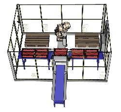 pallet PACker zum Depalettieren von E2 Kisten mit Puffer, angetriebener Rollenbahn und Leerpalettenmagazin. |