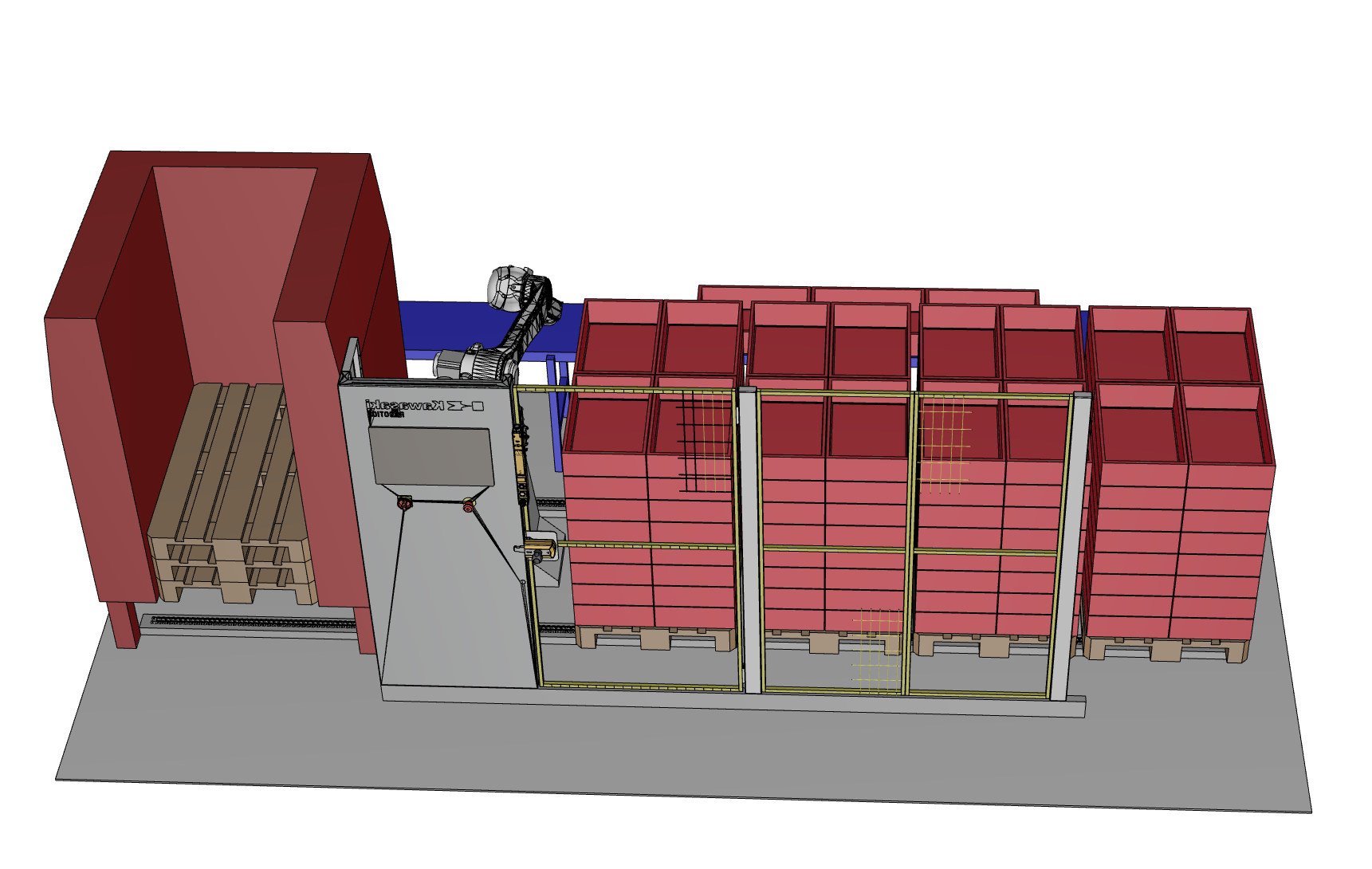 Ausgehend von dem Kooperationsprodukt "K-PALL" unseres Lieferanten Kawasaki Robotics, bieten wir den pallet PACker individualisiert an. Im Gegensatz zur Standardmaschine von Kawasaki bekommen Sie bei uns: