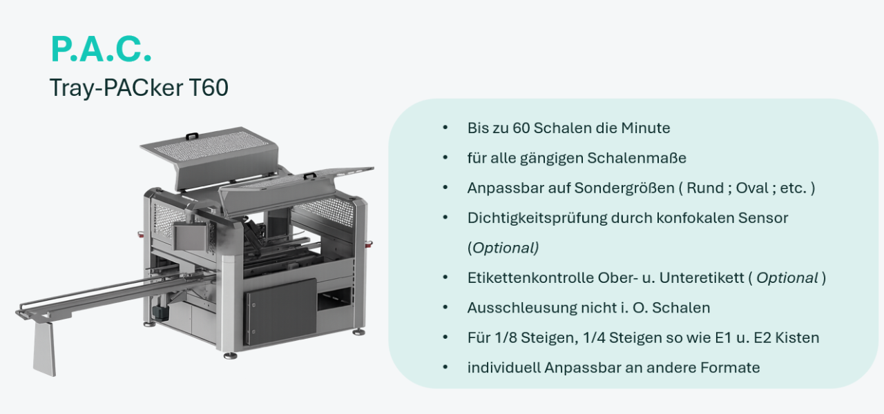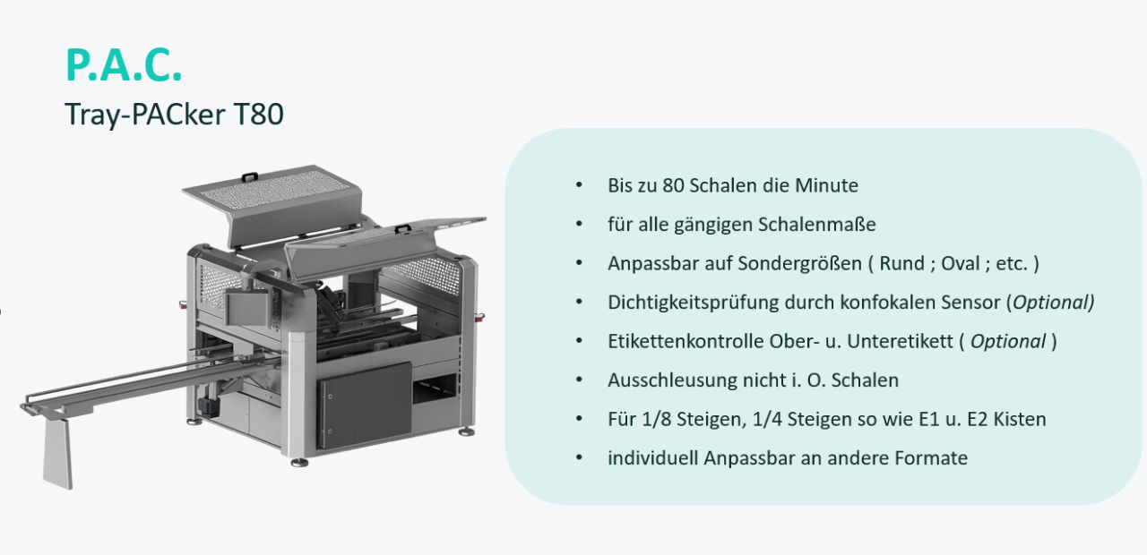 Unser Portfoliopraktisch, performant, kompakt. Der TrayPACker ist eine leistungsstarke Verpackungslösung für industrielle Anwendungen, die Produkte zuverlässig und präzise in dafür vorgesehene Karton-Steigen verpackt. Ausgelegt für hohe Durchsatzraten verarbeitet die Anlage je nach Konfiguration zwischen 60 und 120 Verpackungen pro Minute und gewährleistet dabei eine konstant hohe Prozesssicherheit. Dank des modularen und kundenindividuellen Aufbaus lässt sich die Maschine exakt auf produktspezifische Anforderungen, unterschiedliche Formate und bestehende Linienkonzepte abstimmen. Die kompakte, platzsparende Bauweise ermöglicht eine einfache Integration auch bei begrenzten Platzverhältnissen in der Produktion. Durch einen hohen Automatisierungsgrad reduziert der TrayPACker den manuellen Eingriff auf ein Minimum und trägt so nachhaltig zur Senkung des Personalaufwands sowie zur Steigerung der Wirtschaftlichkeit bei. |